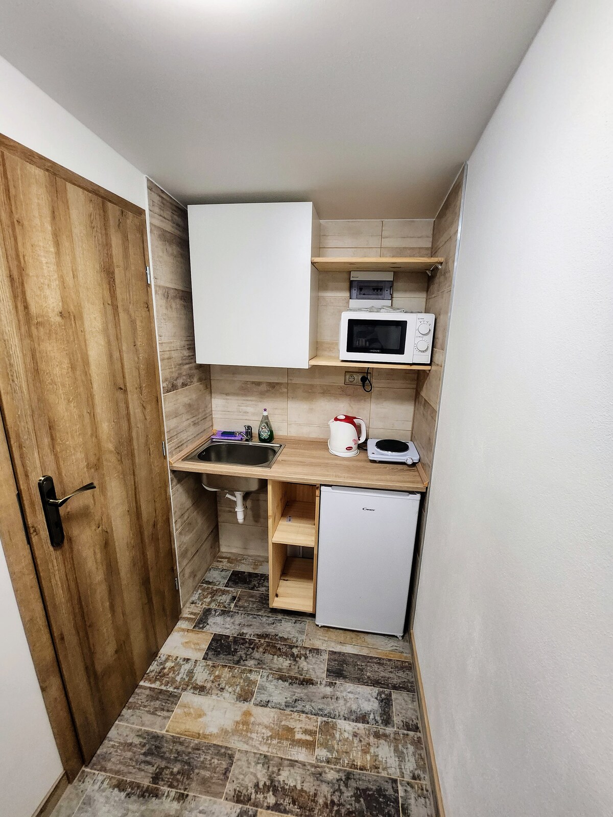 Apartamento confortável e espaçoso para aqueles que apreciam a conveniência e a proximidade com o centro. O apartamento tem um quarto independente para 2 pessoas e uma sala de estar com um sofá-cama (até 2 pessoas), uma kitchenette totalmente equipada e uma casa de banho confortável. O apartamento tem uma entrada para um pátio privado. Também tem estacionamento gratuito e monitorizado e uma excelente localização em frente ao centro e paragens de autocarro para acesso a copos de montanha.