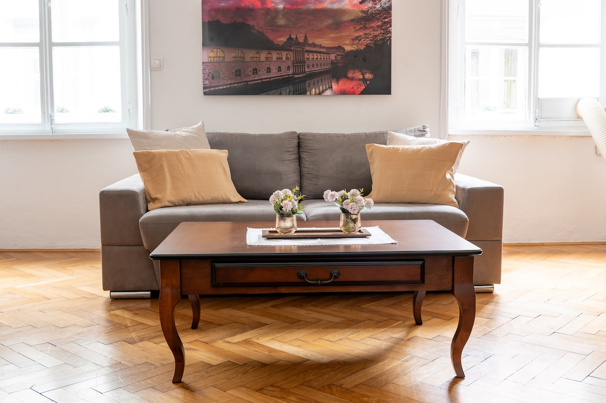Ljubljana centre, river view, balcony & bikes, easy nearby parking. This wonderful art deco style downtown apartment has been renovated to a high standard and offers a fantastic location close to the famous Dragon Bridge, central market and the old town. It combines comfort and elegance with excellent access to all amenities and sights whilst preserving a feel of local life here in Ljubljana. It has its own private balcony overlooking the river and garden.