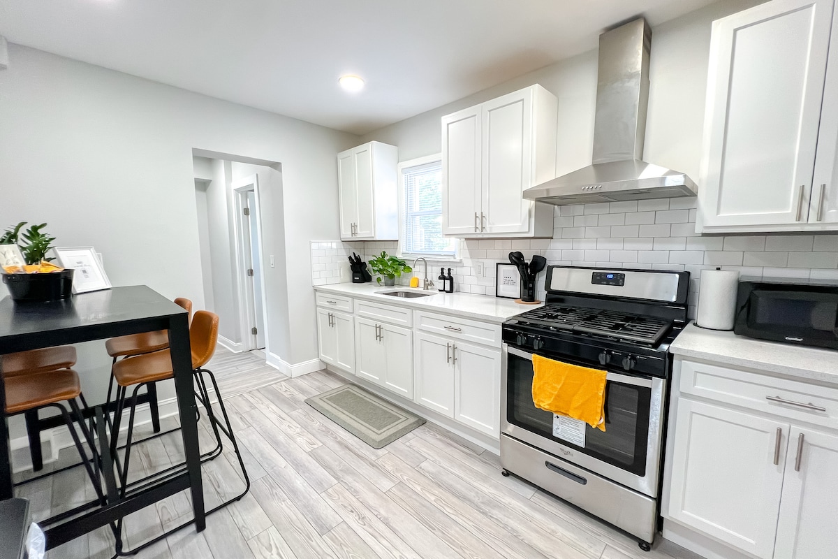Este apartamento no 2º andar recentemente renovado com uma decoração moderna e elegante tem tudo o que você pode precisar em um só lugar - cozinha totalmente equipada com eletrodomésticos de aço inoxidável, cafeteira Keurig, máquina de lavar e secar roupa, sofá grande, TV de tela grande. Há espaço para acomodar confortavelmente até 3 pessoas neste apartamento de 1 quarto/1 banheiro (a 3ª pessoa pode ser acomodada no sofá grande e confortável). Entrada privativa codificada localizada na frente da casa. Comodidades ao ar livre para desfrutar também.