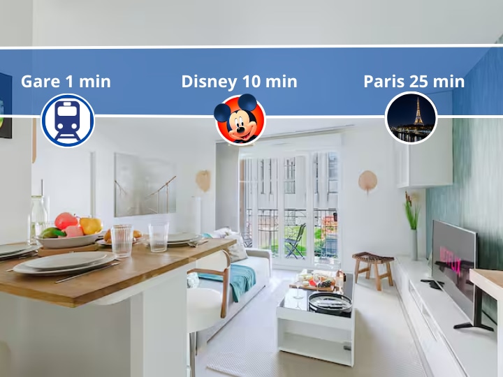 💥Disneyland a 10 min, Paris direto! Apartamento renovado, charmoso e novo, com estacionamento privado e 👉 check-in autónomo. A 2 passos da RER A, mas super tranquilo, bem localizado, tudo nas imediações 😇 🏡 Localizado no 5º e último andar de uma residência com elevador, 34m2 bem organizado, ideal para famílias com bebés/crianças/grupos de amigos numa estadia relaxante (até 4 pessoas). 🍀 Disneyland Paris a 3 paragens (10 min), Paris a 8-12 estações (20 min): o compromisso perfeito entre calma e acessibilidade!