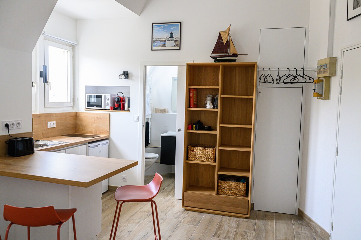 O estúdio da Julie era a casa da nossa filha estudante. Depois de um ano de obras (isolamento, reorganização e decoração), tornou-se nosso pé-rapado em Angers durante nossas partidas de trem pela manhã. E estamos felizes em compartilhá-lo com você nesta nova configuração. É luminoso e colorido, totalmente equipado e totalmente independente. O bairro é muito animado e central, mas o estúdio é extremamente tranquilo, pois tem vista para um pátio interno.