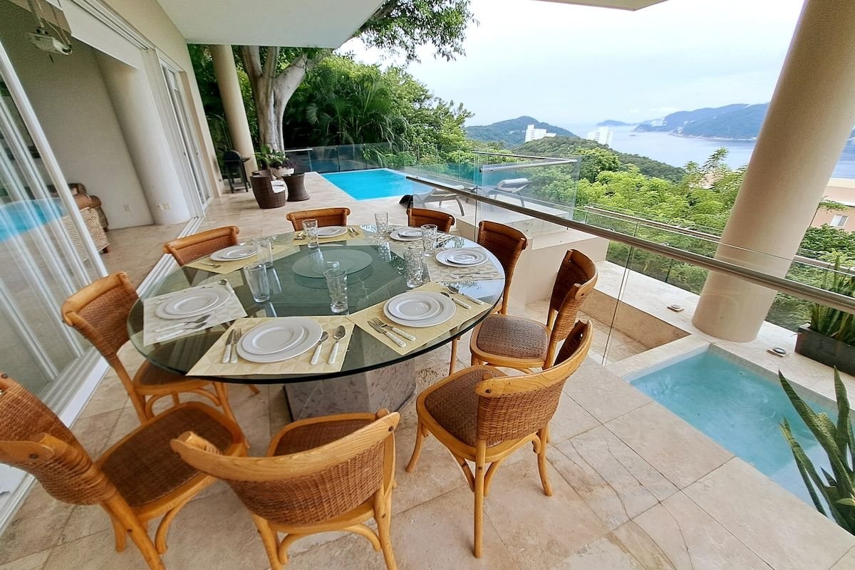 Totalmente renovada depois de Otis: Linda moradia branca em estilo descontraído e de praia com detalhes artesanais mexicanos. Piscina privada, 3 quartos com ar condicionado, 2 estúdios, sala de estar e jantar, todos com vista total para o Oceano Pacífico. Chegada de carro altamente recomendada, 2 vagas de estacionamento disponíveis. Club house com uma grande piscina, sauna, ginásio. Limpeza incluída, serviço de cozinha disponível mediante pedido. Segurança 24h. Caminho de corrida/caminhada disponível através de Brisas, com vista para a baía de Acapulco.