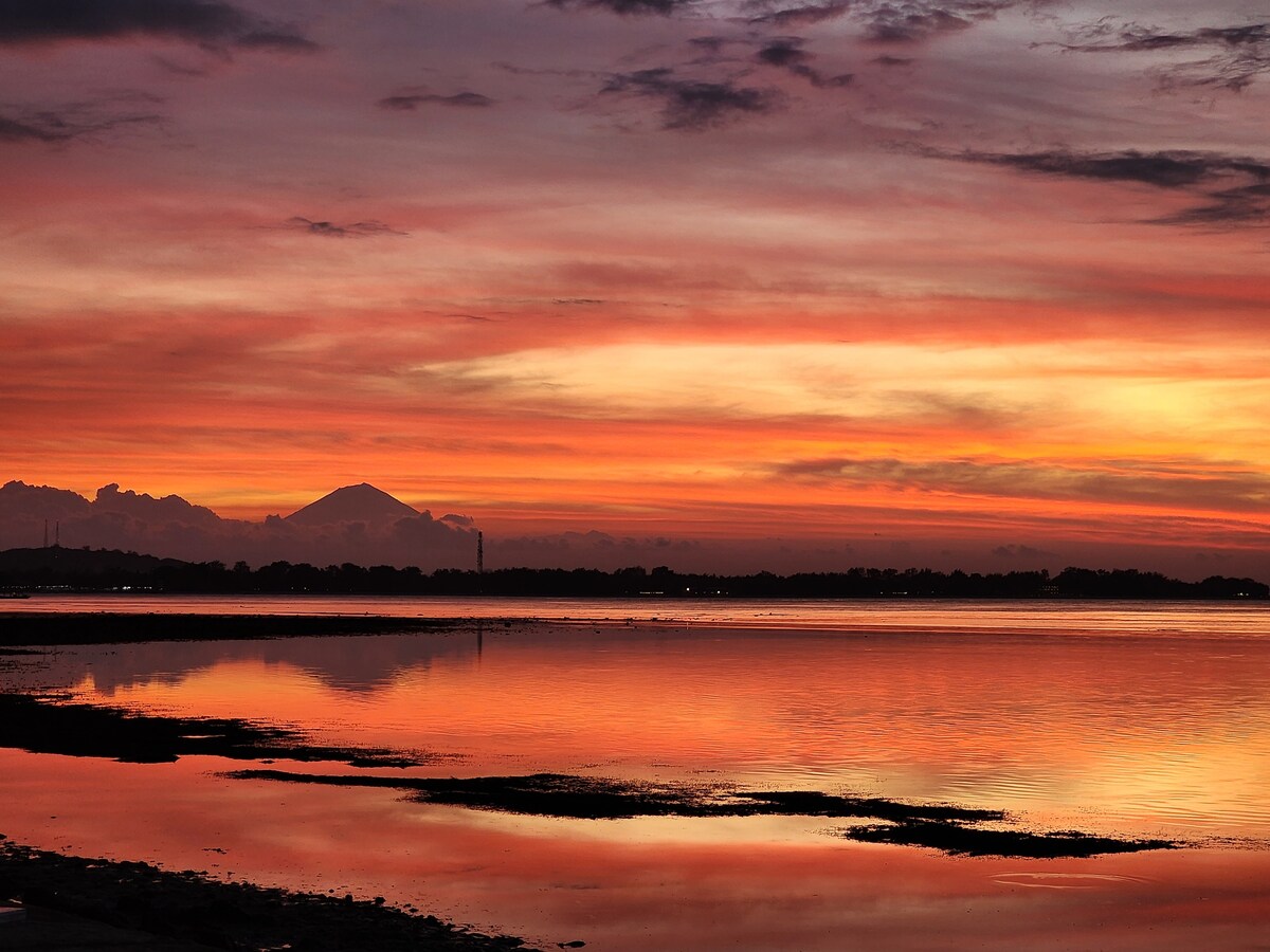 O apartamento YIN Seaview 2 é 1 de 3 apartamentos na melhor praia de GiliT! Acorde com vistas do nascer do sol em Gili Meno. Acomoda 2 adultos (cama king size confortável) e 1 criança (colchão de solteiro) com ar-condicionado completo. Varanda à beira-mar com sofá-cama e cozinha pequena para cozinhar levemente. Divirta-se e observe a vida na rua abaixo! Ao lado do Gili Divers com muitos restaurantes e lojas à sua porta! Um dos poucos lugares com vista para a praia da sua varanda para a praia de mergulho com snorkel, Wi-Fi também é fornecido, gratuitamente!