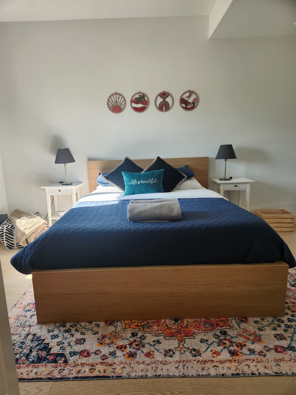 Feel yourself at home in this comfortable private bedroom in our basement. Your room comes with a double-size bed and private bathroom, plus access to a shared living area where we occasionally pass through to reach storage/laundry room. This is a calm, spacious spot to rest after a day of exploring or working. Minutes from 24/7 Circle K, grocery stores, and restaurants 5 minutes drive to Highway 401 24/7 camera monitoring. Make yourself at home—brew your morning coffee, stretch out with a book.