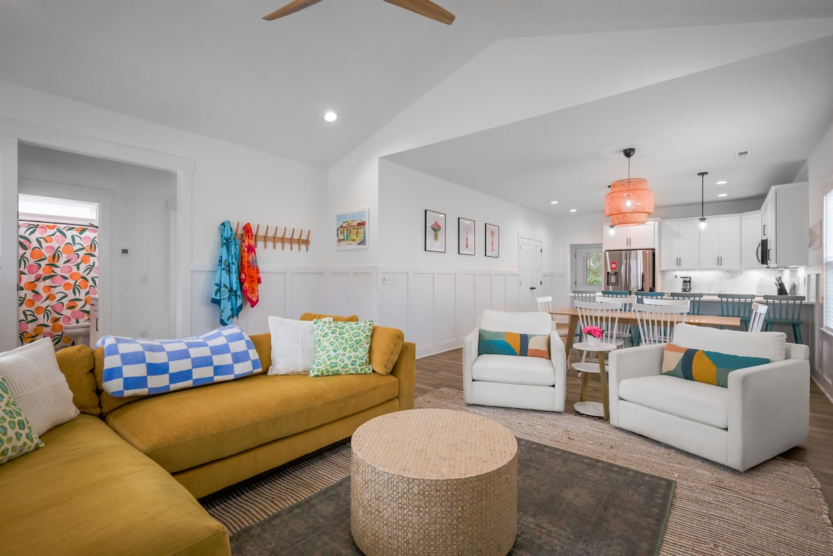 Faça uma pausa para relaxar neste acolhedor bangalô de praia! O Beach Bungalow é decorado com cores tropicais quentes e toques de uma decoração de surfe. Este é o refúgio perfeito para sair com a família, amigos ou apenas para escapar das multidões. Siga o som das ondas batendo suavemente na costa e, em poucos minutos, você logo estará mergulhando os dedos dos pés na areia. Um lote de canto privado com fácil acesso ao estacionamento. Além disso, o local perfeito para relaxar na varanda de tela ou relaxar na rede sombreada.