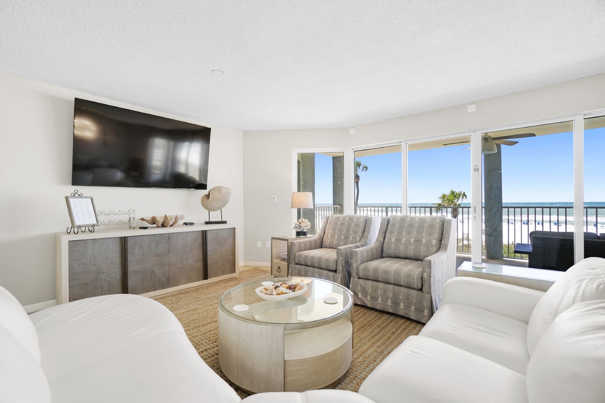 Apartamento de luxo recém-renovado em frente à praia no 13º andar com 3BR/2BA, tetos altos, vistas deslumbrantes para o mar, 2 camas king size, 1 cama queen size e duas camas individuais, sala de estar espaçosa. Desfrute de uma piscina aquecida, sala de fitness e área de piquenique com grelhador. A pé até ao Pineapple Willy’s e a restaurantes nas proximidades; perto do WonderWorks, do Ripley’s Believe It or Not, do Shipwreck Island Water Park, do minigolfe Coconut Creek e do cais do condado. Edifício tranquilo, 2 elevadores. 5 milhas do Pier Park, estacionamento pago do outro lado da rua.