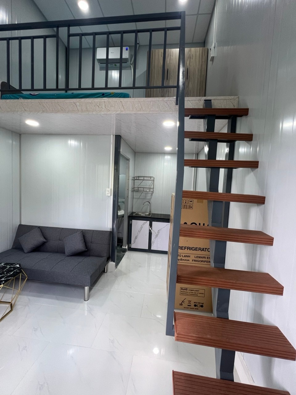 A localização do edifício é no bairro de An Binh. Uma grande fila de carros a caminho do espaço. Terá acesso ao edifício ao digitalizar a sua impressão digital no portão; em seguida, apanhará o elevador até ao 3.º andar e, depois, continuará a subir as escadas até ao último piso. No terraço, apenas esse quarto é seu. Tem um terraço muito grande, pode fazer uma festa ao ar livre, apanhar ar, uma vista panorâmica de 360 graus em redor do edifício. Além disso, o quarto está totalmente equipado com todo o mobiliário, para que possam ficar, cozinhar e viver como se estivessem em casa.