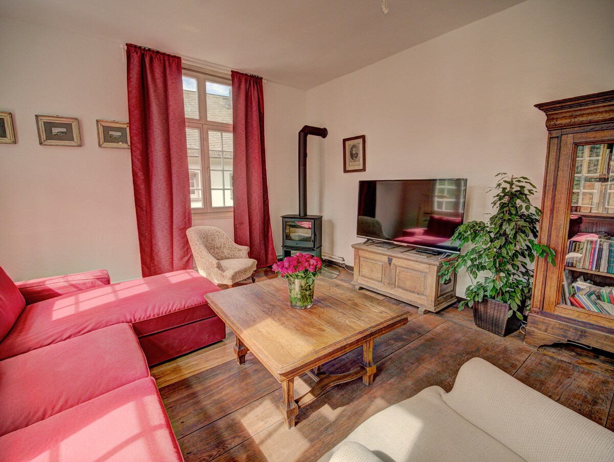 Mergulhe no apogeu da indústria de tecelagem de Monschau. A família Scheibler construiu outra vila espaçosa aqui ao lado do marco da cidade, a Casa Vermelha, em 1785. Os móveis antigos e os ancestrais nas paredes testemunham o esplendor do passado. Uma cozinha moderna e bem equipada com máquina de lavar louça está disponível, bem como confortáveis camas boxspring para a noite e Wi-Fi e TV via satélite com assinatura Netflix. O Bel-Etage está localizado no térreo da casa.