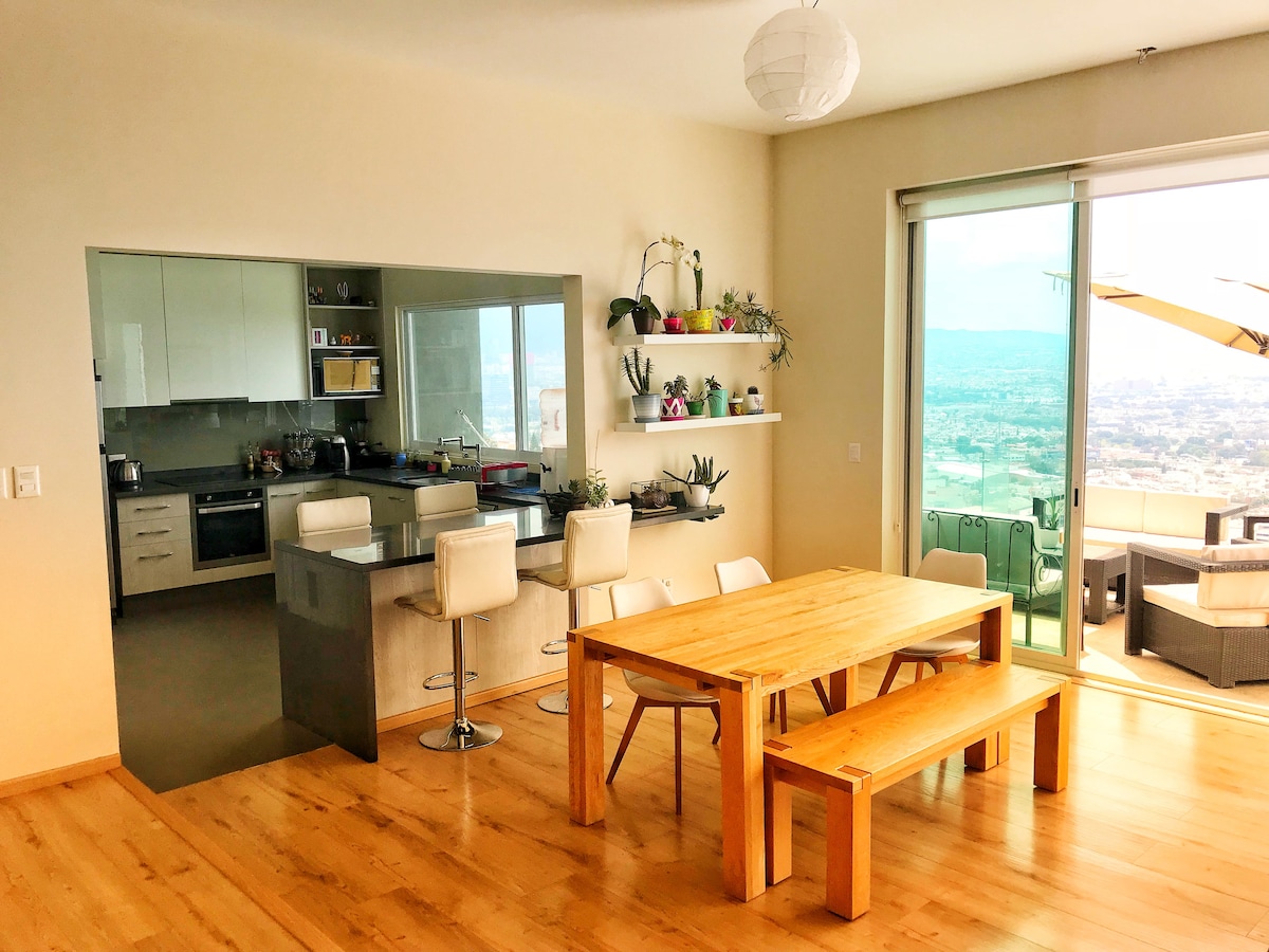 O nosso apartamento tem um grande terraço com uma vista esplêndida de Querétaro! Possui 2 pisos, o primeiro tem 3 quartos agradáveis e o segundo tem uma grande sala de estar e uma cozinha aberta com acesso ao terraço. Todos os espaços são luminosos e modernos. O centro histórico de Querétaro ou o centro da cidade ficam a apenas 10 minutos de carro! Zona muito segura e calma. (Guarda de segurança na entrada da rua)