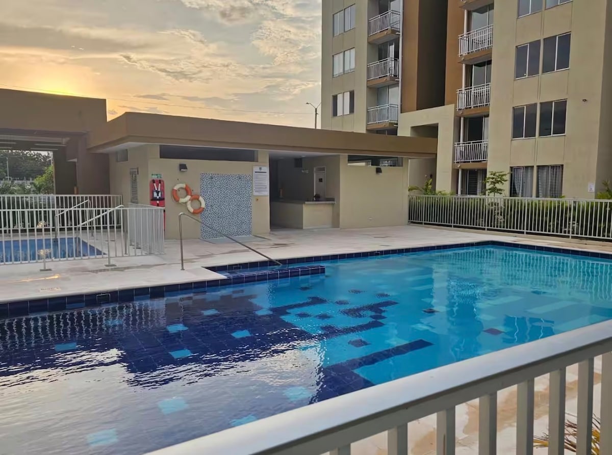 Apartamento Completo em Valledupar: Localização Premium. A poucos passos do C.C. Mayales. 3 quartos, 2 casas de banho, sala de estar, cozinha equipada e varanda. Desfrute da piscina, das áreas sociais e do estacionamento privado na propriedade. Ideal para famílias ou descanso. A sua estadia perfeita!