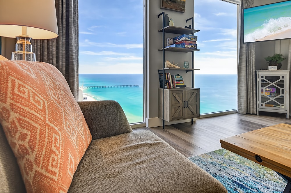 BeachView Paradise is a beautiful 1 bedroom/1 bathroom BEACHFRONT corner penthouse condo located at Tidewater Beach Resort on the 27th floor with jaw dropping views. Recently renovated down to the studs, it was curated with thoughtful design and high end finishes. A quick elevator ride down and you are right at the pools or the beach. All of this in a beachfront resort full of amenities and a quick walk to Pier Park loaded with restaurants, shopping and family fun. Take a look!