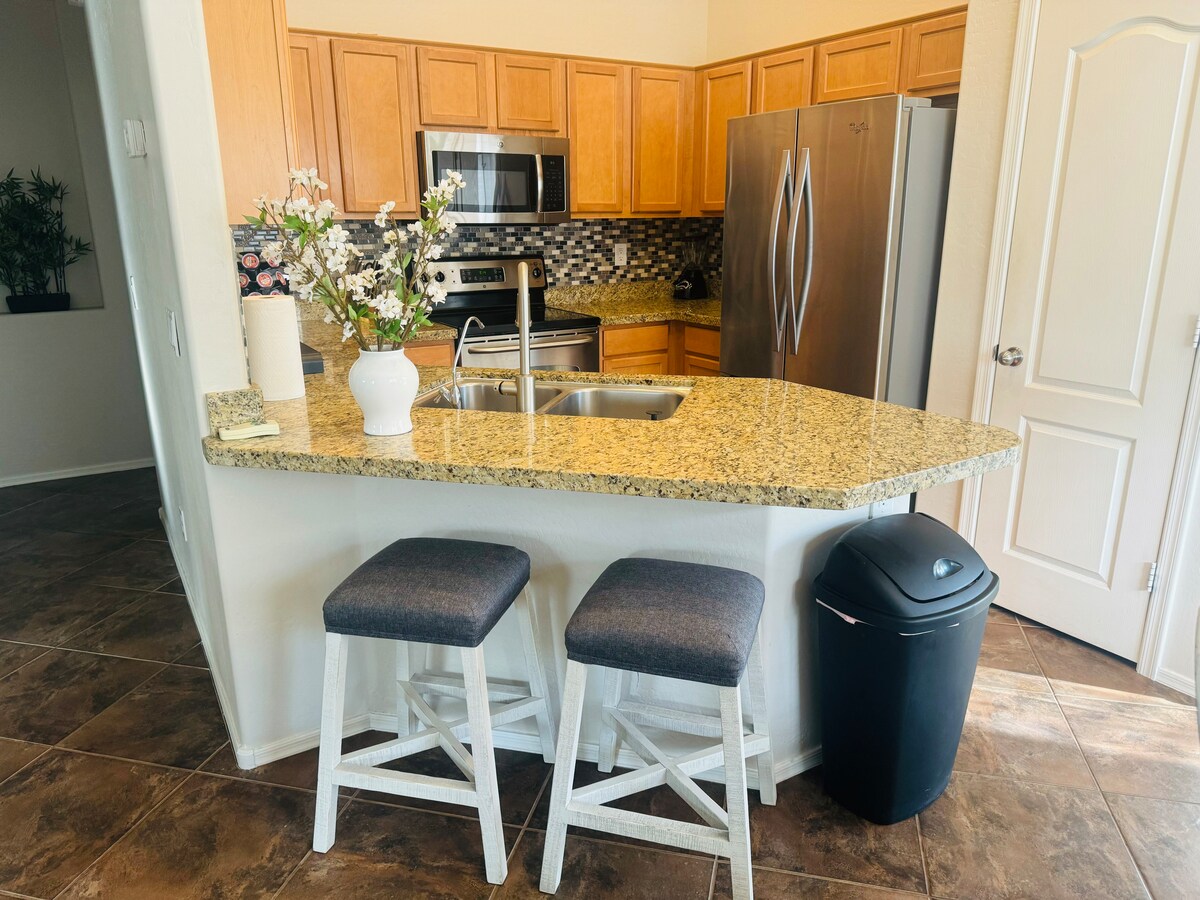 Traga toda a família e amigos para este paraíso no deserto! O quintal possui uma piscina cintilante (com portão de segurança para crianças), jacuzzi e área de pátio/churrasqueira equipada com uma cesta de basquete à beira da piscina, brinquedos de piscina, coletes salva-vidas e móveis ao ar livre para todos desfrutarem. O interior espaçoso foi meticulosamente atualizado e decorado para proporcionar o máximo conforto. Uma cozinha totalmente abastecida e banheiros terão tudo o que você precisa para se sentir em casa. Animais de estimação não permitidos Não é permitido fumar dentro da casa