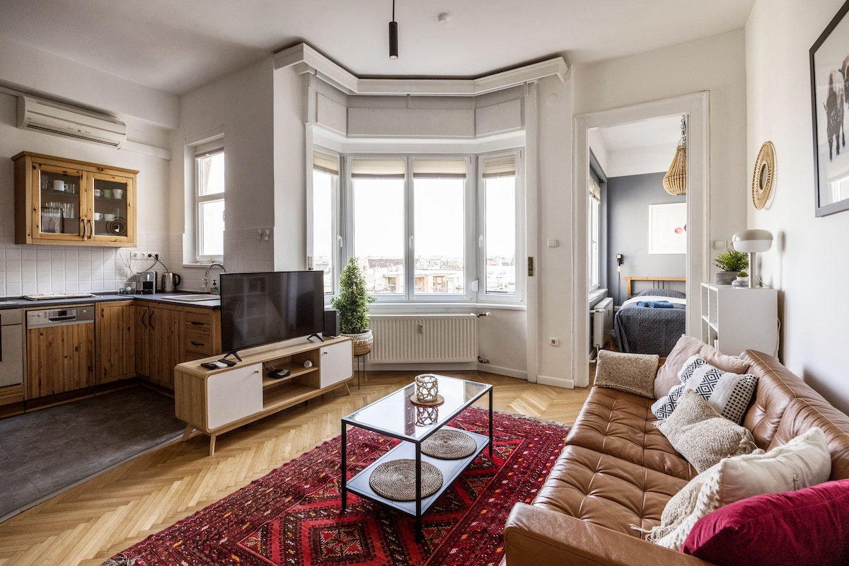 Enjoy Budapest from this sun-drenched, quiet retreat in the heart of Buda, steps from the Danube and thermal baths. The highlight is a large private terrace with breathtaking panoramic city views. This vintage-style home combines historic charm with modern comforts like fast Wi-Fi, AC and a full kitchen. Elevator & bright rooms. Located on a popular street famous for its bakeries and bistros, you’ll stay in the city’s most authentic neighborhood. Perfect for long stays and a peaceful stay.