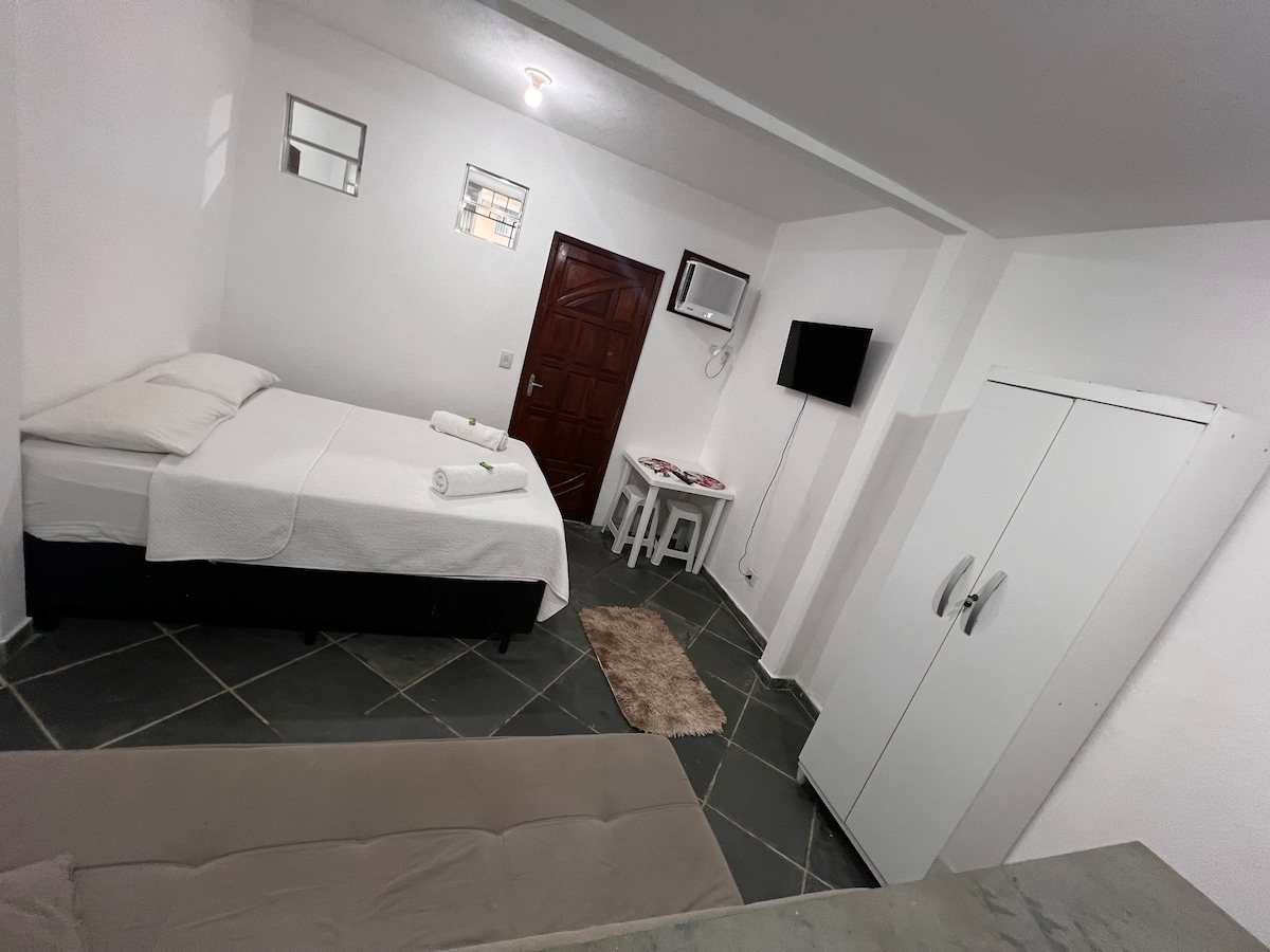 A praticidade que você precisa!! Suíte com ar condicionado,sofá cama de casal,Wi-Fi,TV SMART,utensílios de cozinha,microondas,fogão,geladeira,banheiro e entrada independente!! Ofertamos roupas de cama e toalhas para melhor servi-los! Espaço para colocar bicicleta ou moto,além de entrada bem iluminada.