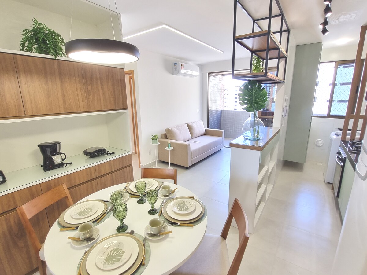 Flat aconchegante, moderno, 30m2, possui uma bela vista para o mar da Pajuçara (vista lateral - varanda), planejado, equipado com geladeira, micro-ondas, forno elétrico, cooktop, liquidificador, grill, cafeteira Tres Corações, talheres e utensílios básicos de cozinha, Smart TV 43", Wi-Fi, ar-condionado de 18000btus, mesa de jantar com 4 cadeiras mais mesinha de apoio e armário amplo para roupas. Roupas de cama e banho são fornecidos. Possui uma cama de casal e um sofá-cama para 2 pessoas.