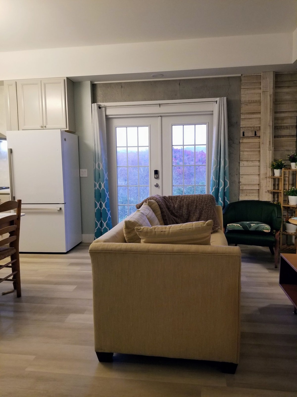 Nestled in the woods just 2 miles from downtown Highlands, our lakefront bungalow offers a secluded getaway that's close to town giving you the best of both worlds. This is a newly constructed space in our exposed basement with windows in every room and new furniture throughout. It features a deck overlooking the lake, a separate side deck, a full kitchen and a master bedroom with a sleep number bed. There is a stacked washer/dryer and the living room and both bedrooms have flat screen TVs.