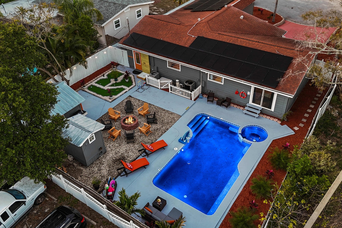 Escape to a tropical paradise in sunny Seminole! This stunning retreat features a lush backyard with a heated pool, hot tub, barrel sauna, putting green and a speakeasy style movie theater. Just minutes from award-winning Gulf Coast beaches, state parks vibrant dining, and shopping, this haven offers the perfect blend of relaxation and adventure. Whether you're soaking up the sun, exploring local attractions, or enjoying movie nights, our home is your ultimate getaway destination.