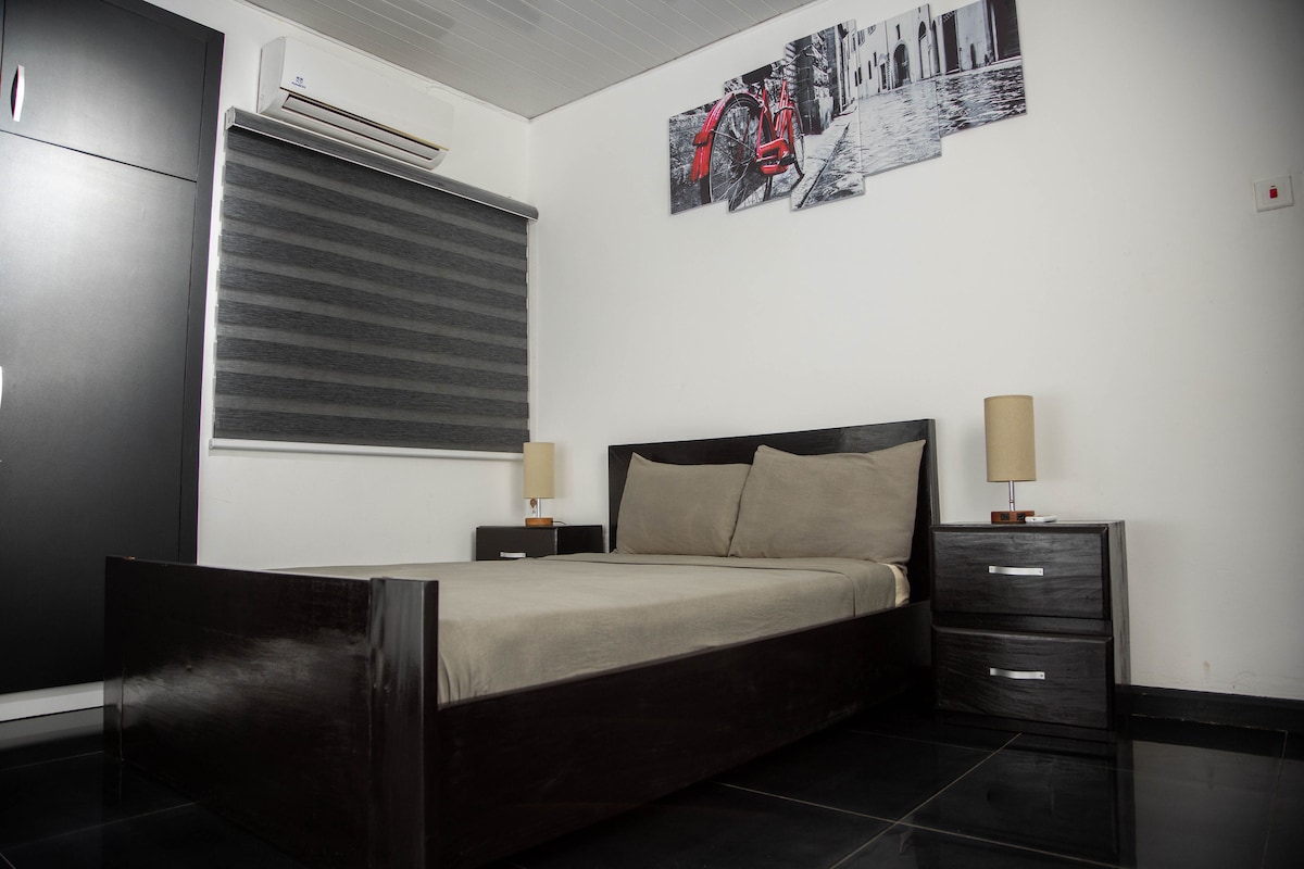 This apartment is located within Mariville Homes Estate, a gated residential community off Spintex Road, near Manet Junction. Conveniently situated just a 15-minute drive from the airport, the property offers a secure and serene environment. The estate is gated and monitored 24/7 by private security, ensuring controlled access. The apartment features two bedrooms and can comfortably accommodate up to four guests. Both bedrooms are en suite and feature king-size beds.