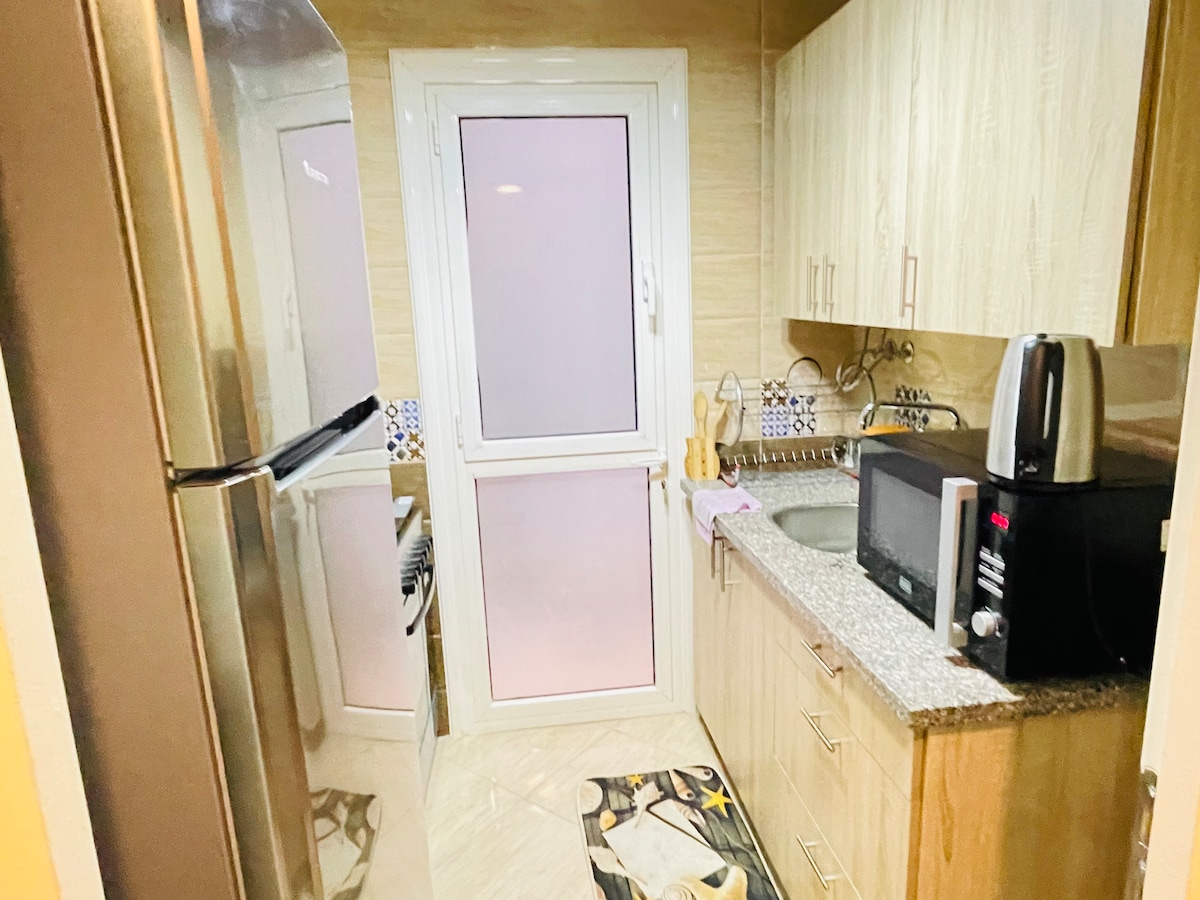 Um APARTAMENTO INTEIRO com um jardim nos fundos situado em uma área bonita e verde em uma comunidade pacificamente integrada, atendendo a todas as necessidades dos residentes. Os quartos são recém-mobiliados, com ar condicionado, TV inteligente e todas as comodidades que você pode precisar, super LIMPO e SILENCIOSO. O apartamento fica a 25 minutos do Aeroporto Internacional do Cairo. Cafés, restaurantes, supermercados e farmácias estão todos nas proximidades. Qualidade padrão de hotel com conforto oferecido com um PREÇO RAZOÁVEL.
