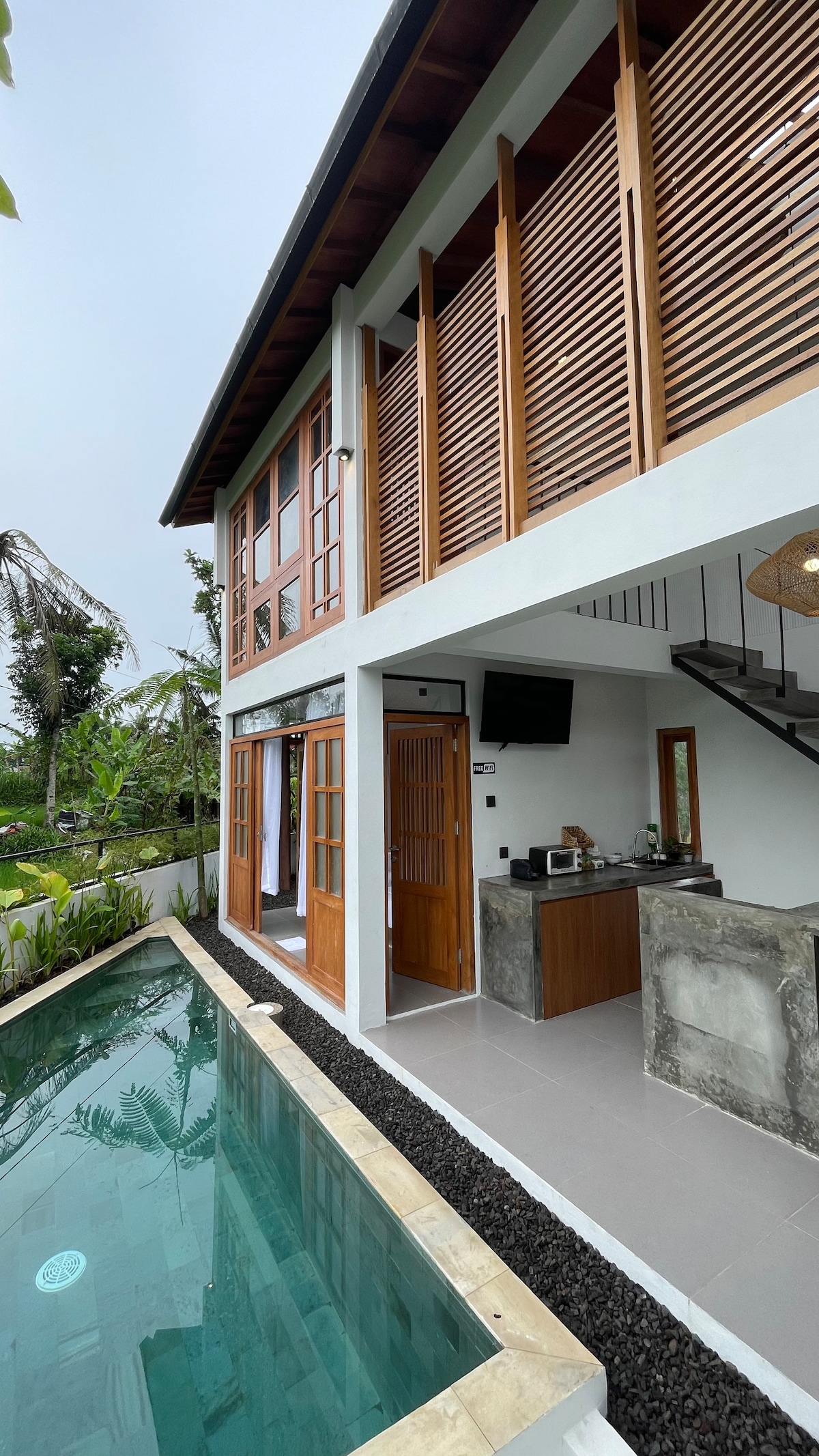 Moradia de 2 quartos com piscina privada e um acolhedor lounge exterior. Cada quarto tem uma casa de banho privativa com uma banheira. Desfrute de noites de cinema com o projetor. Também fornecemos 2 camas extra para hóspedes adicionais. Cozinha totalmente equipada e mesa de jantar. Perfeito para famílias ou amigos que procuram uma estadia moderna rodeada de vegetação e uma atmosfera tranquila.