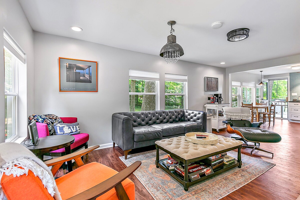 Relaxe neste espaço calmo e cheio de estilo. Aninhado entre as árvores, proporciona uma escapada tranquila do caos da vida, permitindo que você recarregue e renove. A residência principal fica a aproximadamente 400 pés do chalé. O chalé é isolado e ainda perto de atrações locais, restaurantes, ciclismo e trilhas na natureza. A cabana tem um total de 420 pés quadrados de espaço de estar com 280 pés quadrados no térreo e um loft de quarto de 140 pés quadrados.