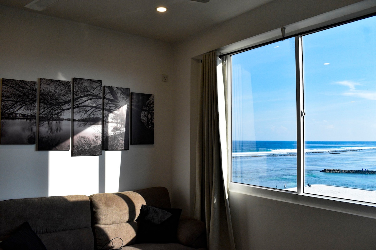 Este apartamento está localizado a apenas 15-20 minutos de carro do Aeroporto Internacional de Malé Desfrute da sua estadia com a sua família neste lugar tranquilo com a vista incrível para o oceano, a brisa suave e o som das ondas do oceano. Poderá ver o nascer do sol e da lua a partir do quarto e da sala de estar. O restaurante FAMILY ROOM está situado no rés-do-chão da casa. Restaurantes, cafés, mercearias e áreas de desportos aquáticos ficam a apenas 4 a 5 minutos a pé da casa.