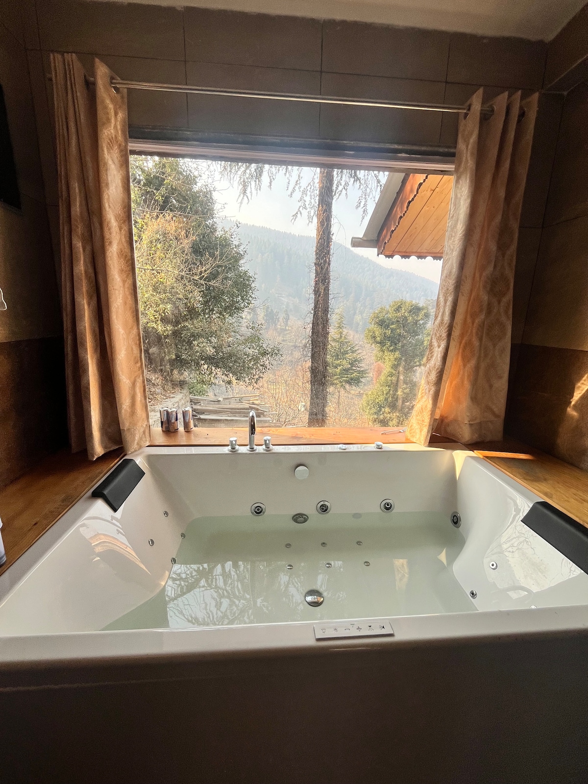 Espaçoso chalé florestal de 3 quartos em Kasol, perfeito para viagens em grupo e celebrações. Desfrute de um jacuzzi privado com vista para a montanha, uma grande varanda e interiores de madeira únicos. Todos os quartos têm casas de banho anexas para conforto e privacidade. Localizado perto do mercado de Kasol com fácil acesso rodoviário. Ideal para aniversários, reuniões e escapadelas de fim de semana. Cozinha não disponível para cozinhar. Apoio de cuidador e chef disponível.
