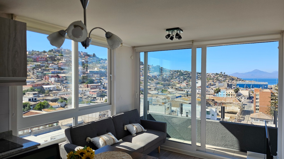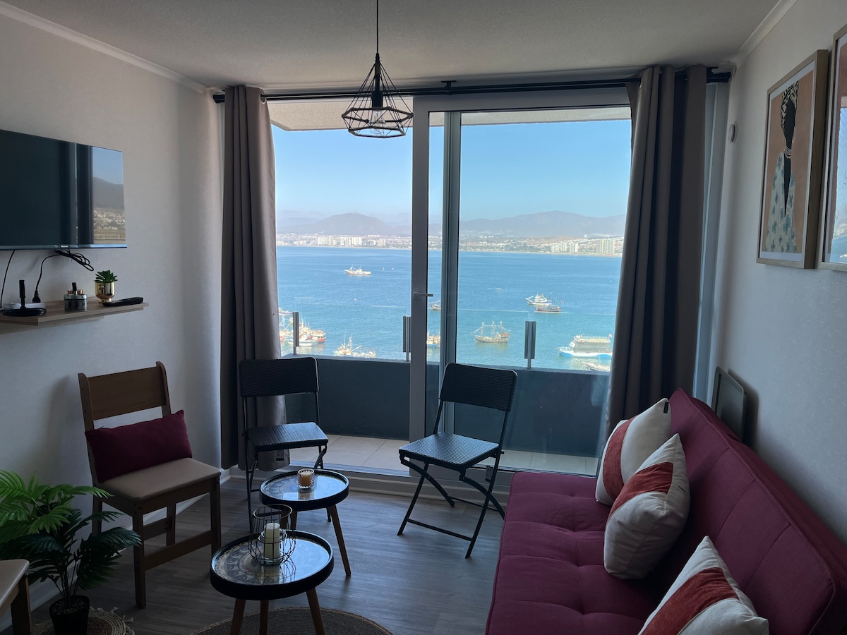 Fuja para Coquimbo! Aconchegante apartamento para 5 pessoas em frente à praia, com 2 quartos (cama de casal, beliche e sofá-cama), cozinha totalmente equipada, Wi-Fi, máquina de lavar/secar, vigilância 24 horas, estacionamento privativo e elevador (13º andar). Localizado a apenas 2 quarteirões do Mall Vivo, Centro, supermercados, terminal de ônibus, caleta, ao lado da feira local e atividades como passeios de barco pirata. Ideal para descansar, aproveitar o mar e explorar a região. Reserve a sua estadia e viva a experiência!