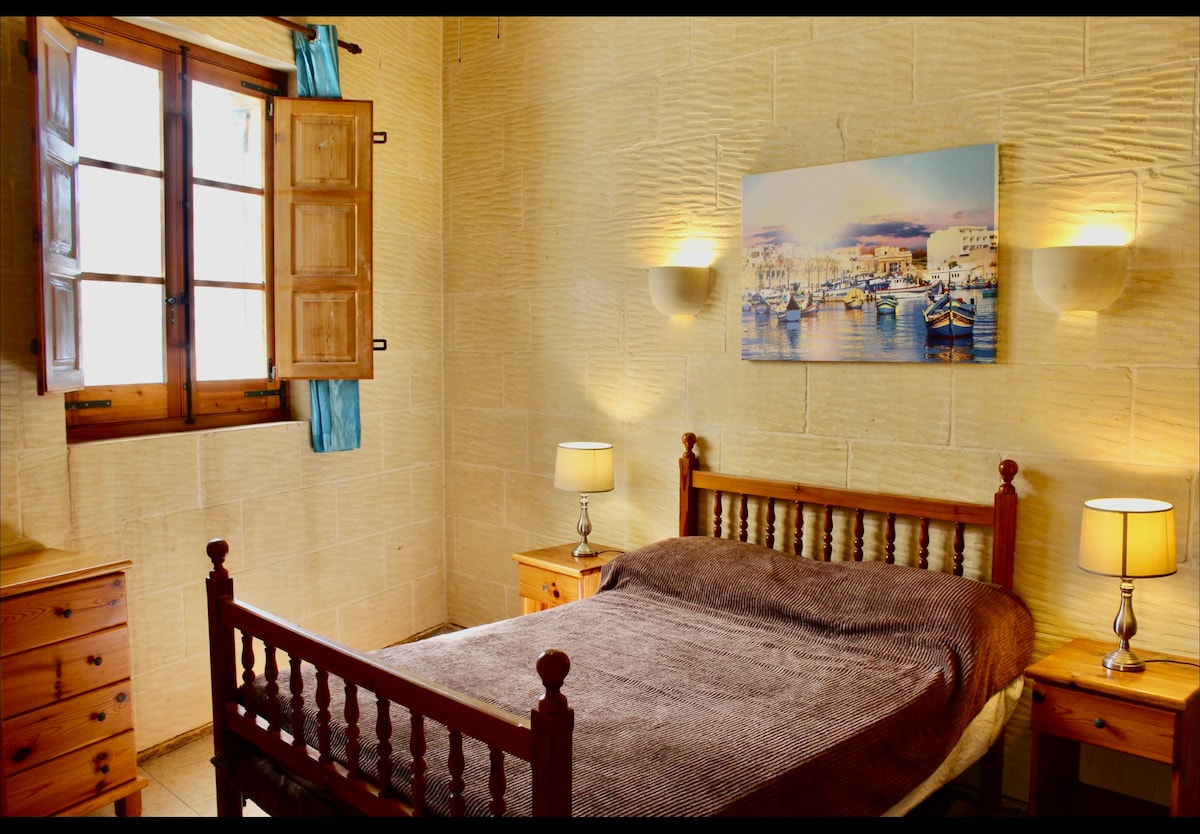Experimente 800 anos de história na nossa bela e renovada Ta' Karmenu Guest House! A poucos passos de Mdina e do centro de Rabat, combina conforto moderno com charme histórico. Três pisos oferecem 3 quartos únicos, cada um com casa de banho privativa. A cave tem uma cozinha comum e uma área de refeições. Este quarto fica no primeiro andar e inclui um sofá-cama para o terceiro hóspede. O elevador serve todos os andares dos quartos. Perfeito para amantes da história, casais ou famílias que procuram uma estadia maltesa única