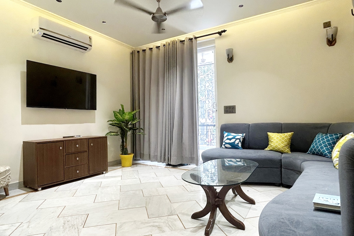 O nosso apartamento de dois quartos tem um verdadeiro espírito citadino. Aloja confortavelmente quatro pessoas. Terá todo o apartamento só para si: um belo jardim, uma cozinha bem equipada e um escritório acolhedor. O apartamento oferece fácil acesso ao complexo histórico Qutab Minar, a vários parques e a centros comerciais com restaurantes e cinemas. Também fica a uma curta distância a pé dos hospitais Max e Max Smart Super Speciality. Deslocar-se é conveniente com o Metro (linha amarela) a apenas dois minutos a pé.