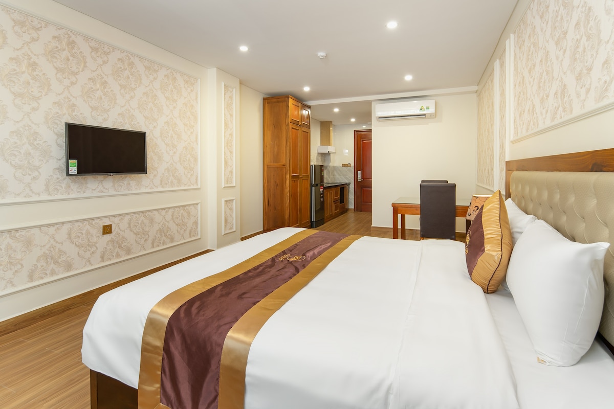 Localizado a 150 m da My Khe Beach, o Altara Suites oferece unidades à beira-mar em Da Nang. A luxuosa unidade de 2 quartos tem uma varanda com casas de banho privativas. A 6,6 km do aeroporto internacional de Da Nang. Lindos cafés e restaurantes a uma curta distância a pé. A unidade de 80 m2 tem uma varanda e televisão por cabo HD. A área de refeições e uma cozinha equipada com um micro-ondas e um frigorífico. Um fogão e uma chaleira também estão em destaque. Há uma casa de banho privativa com toalhas, roupões de banho e chinelos na unidade. Wi-Fi gratuito.