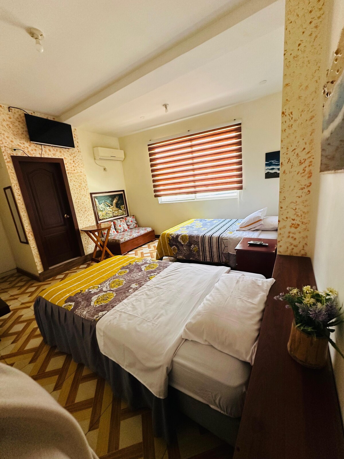 Fuja do movimento e da agitação do Malecon e desfrute da tranquilidade do nosso albergue com vista para a montanha e a apenas 10 minutos a pé da praia. Reserve agora! Nosso quarto com ar-condicionado e chuveiro com água quente pode acomodar até 3 pessoas. Tem uma cama de casal e um beliche. Temos todos os requisitos necessários para tornar sua estadia um prazer, grandes espaços comuns, estacionamento entre outros