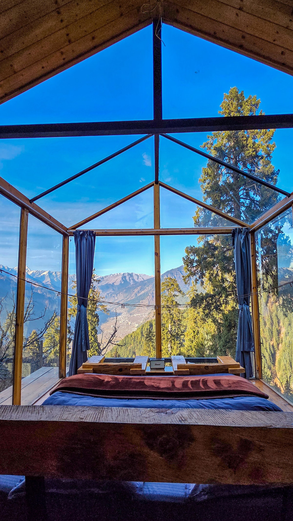 Uma cabana de vidro deslumbrante, nas encostas de Manali. Com vistas panorâmicas e um teto de vidro, acorde para a floresta e adormeça sob as estrelas. Situada nas profundezas da selva, a enseada é ideal para amantes da natureza e aventureiros. A aventura começa com uma caminhada panorâmica de 1 hora SUBINDO uma montanha: uma mini expedição ao seu paraíso escondido! E não se preocupe, o nosso guia está de costas e as suas malas, tornando a viagem o mais fácil possível.