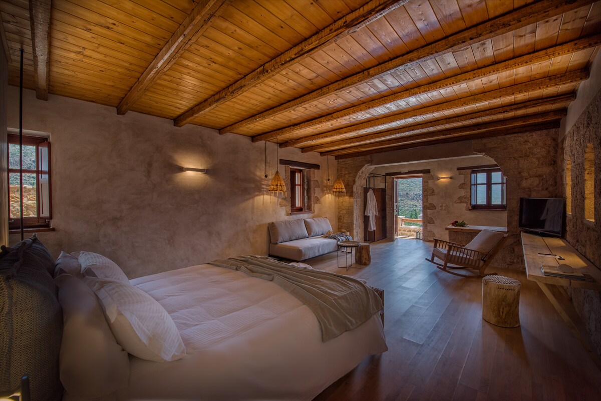 This unique suite combines our philosophy of marrying the traditional and the modern with natural materials. The iron bed with the wooden sofa in front of the stone fireplace together with the glass spacious luxury bathroom create the perfect harmony and warmth. Drink your coffee on the terrace in front of the garden under the stone arches that will offer you coolness.