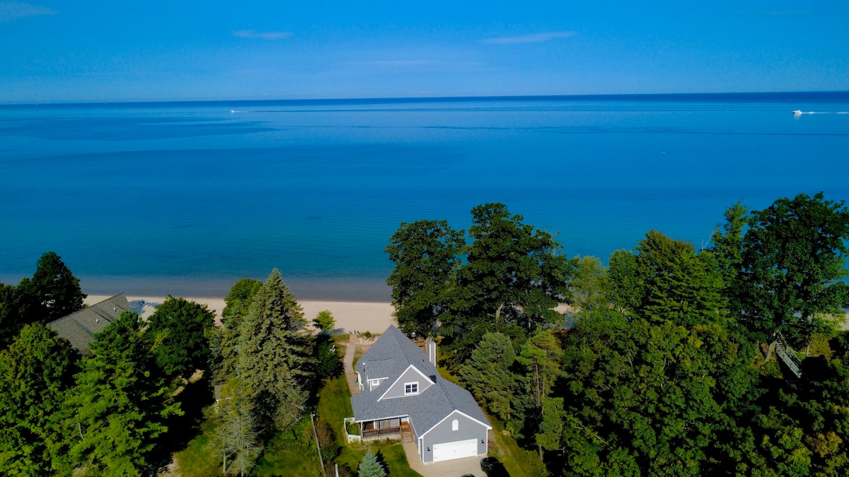 A peaceful place to slow down, reconnect, and refresh; surrounded by the quiet beauty of Northern Michigan. Escape to a spacious 4 bedroom, 2.5 bath gorgeous log home minutes away from the crystal clear, sand dune shores of Lake Michigan and Portage Lake. Equipped with everything you need for the perfect vacation, family reunion or weekend getaway or spiritual retreat! Located in the prestigious Portage Point area of Onekama with only 3 neighboring houses near by on the main road to the beach.