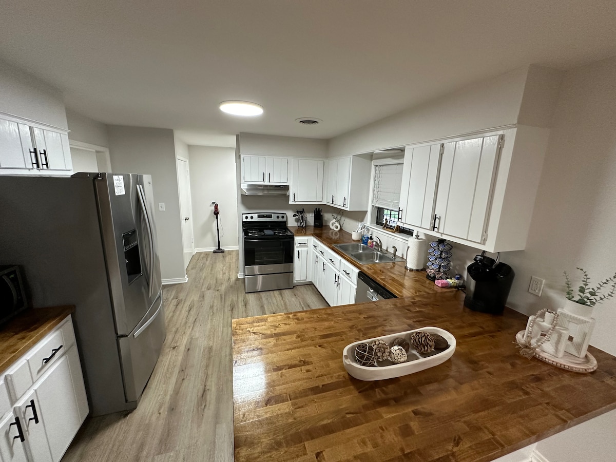 Unwind and enjoy easy access to everything from this centrally located home, here in Tupelo, Ms. It’s super spacious and chic, whether you’re cooking in the kitchen, relaxing in the living room, or enjoying the closed-in patio. It has a outdoor bar area, as well as a fenced in yard. We have card/ board games, cornhole boards, and a fools ball table. There's enough fun for the adults and the kids.