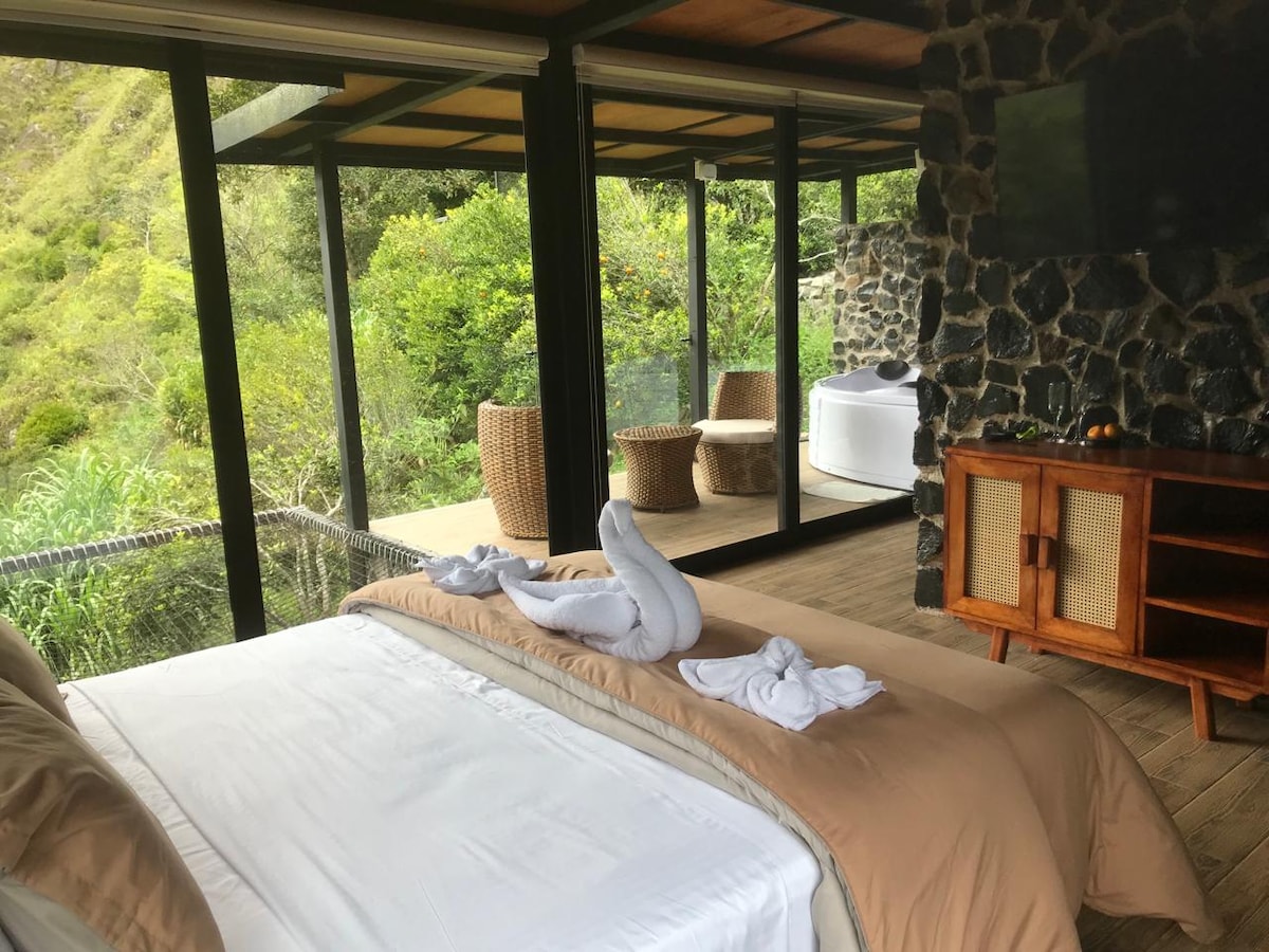 Um glamping exclusivo de cabanas elegantes no meio das montanhas, construídas com pedra, muito perto da cidade turística de Baños. Atendidas pessoalmente pelos proprietários Patricio e Lily. Com vista para o vulcão e o rio, é perfeito para os amantes de caminhadas e atividades ao ar livre. Estrategicamente localizado, permite que você aproveite a natureza e explore as atrações próximas. O design interior reflete um charme rústico, proporcionando um refúgio luxuoso após as atividades ao ar livre.