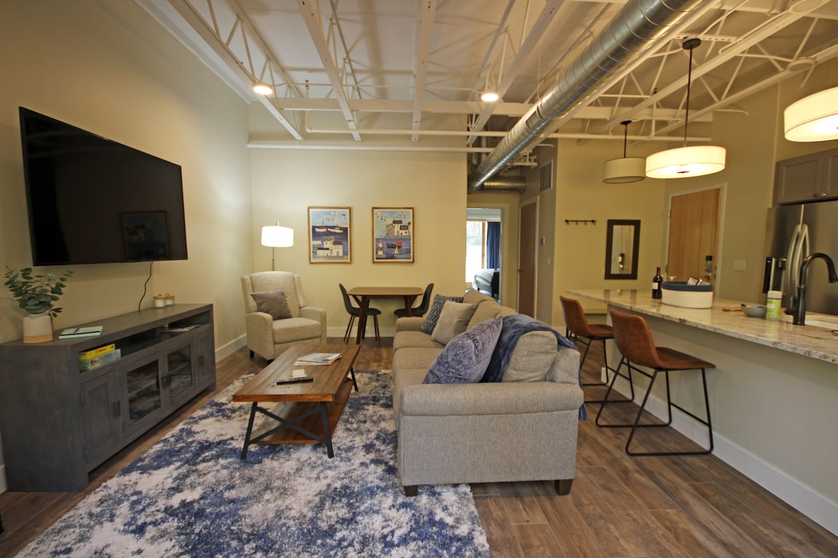 Bem-vindo ao meu condomínio mais bem avaliado de Traverse City! Situado em The Commons na 11th Street, este paraíso do segundo andar espera por você. Descubra uma cozinha pronta para chef. Desfrute de relaxamento com café da manhã em uma das duas varandas com vista para um riacho. Desfrute de uma vida espaçosa com um sofá-cama queen size, área de trabalho e uma ilha de cozinha. O entretenimento espera por você com uma TV 4K de 65 polegadas. Convenientemente perto das praias do oeste, é o melhor retiro para tranquilidade e aventura. Experimente conforto e relaxamento na minha estimada morada.