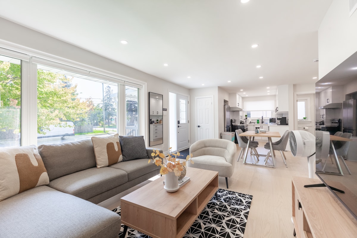 Totalmente renovado, moderno, luminoso, luxuoso e espaçoso (mais de 1800 pés quadrados) apartamento de 2 quartos, 2 banheiros de teto alto acima do solo, entrada separada e pátio para sua próxima casa aconchegante longe de casa! Avaliado com 5 estrelas e top 5% das acomodações no AirBnB! O mais central possível na GTA. Você estará perto do Aeroporto Pearson, da Rodovia 401/404/407, de shoppings, mercearias e uma variedade de restaurantes da moda, cinemas, parques e trilhas de bicicleta/caminhada ao redor Reserve com confiança!