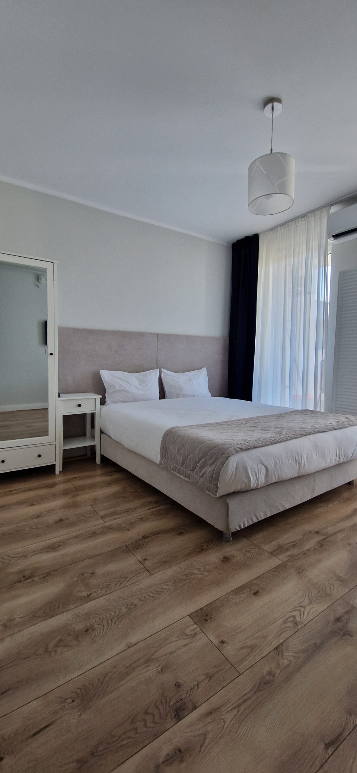 Alugo um apartamento espaçoso com 2 quartos no modo hotel. O apartamento está localizado num novo complexo residencial com uma arquitetura moderna e acabamentos de alta qualidade. O apartamento foi recentemente acabado e mobilado com cozinha equipada com frigorífico de placa de cerâmica, máquina de café , máquina de lavar roupa,micro-ondas, smart TV UHD. Lembre-se de que o apartamento também tem um lugar de estacionamento seguro no pátio do edifício.