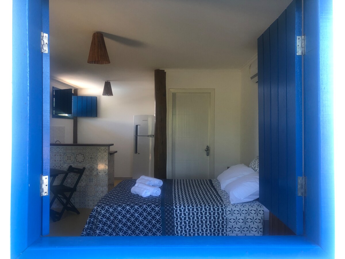 Um refúgio banhado pelo sol, com varanda aberta e vista para o mar. Acorde com o som dos pássaros, tome café com a brisa entrando pela porta e sinta que o tempo parou. Venha viver dias leves. Flat no andar térreo, na Mata Atlântica com uma linda vista para o mar e o Rio de Contas, um refúgio bem próximo do centro de Itacaré.