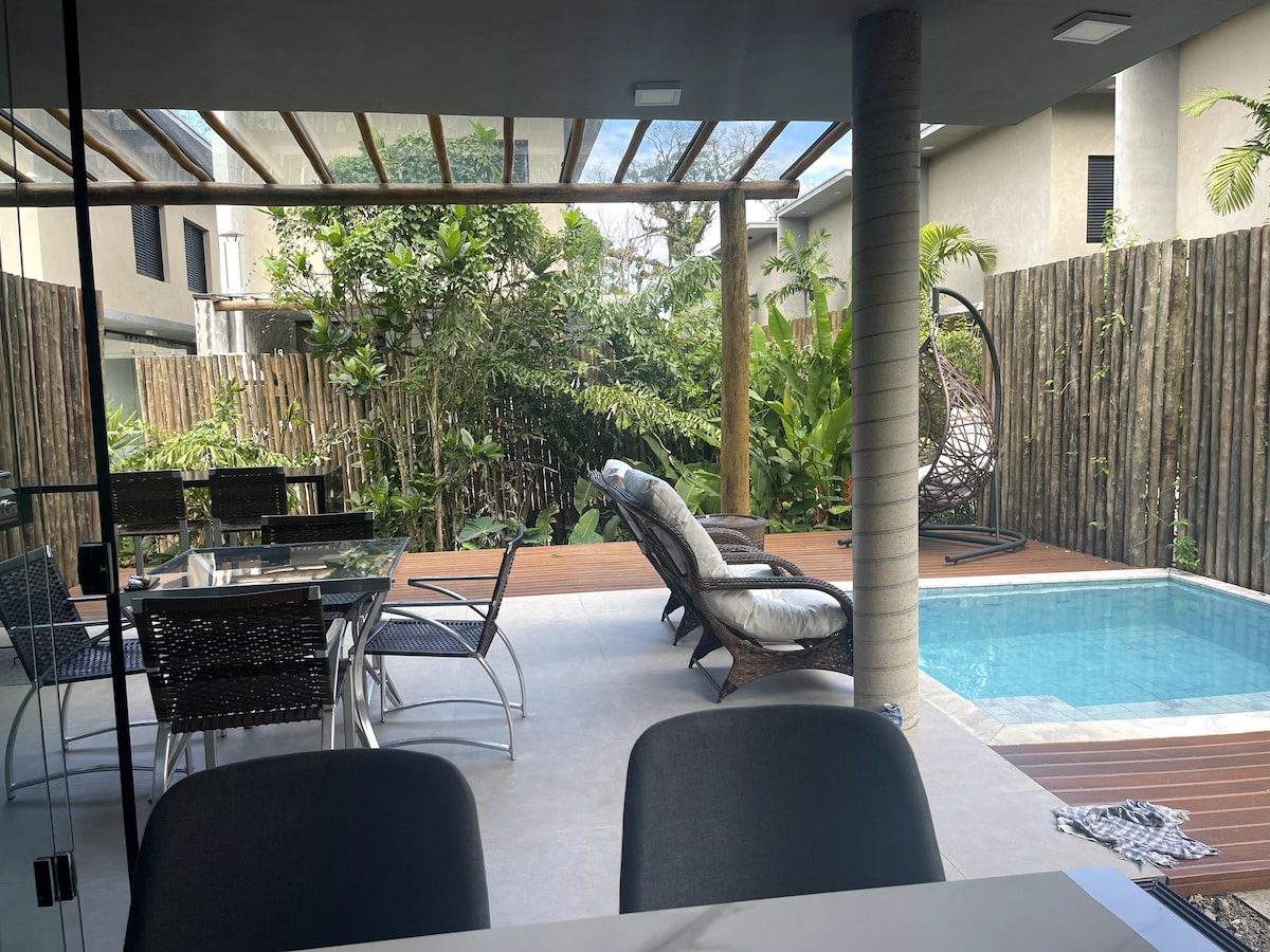 * Linda casa moderna na Av da Praia com PISCINA AQUECIDA 24Hs, 160 m2, ambiente clean, pet friendly, vista incrivel da mata atlantica, churrasqueira, 3 vagas de carro e portaria 24hs em condominio fechado. * Recem entregue na area mais exclusiva de maresias(canto do moreira), a poucos passos da praia. * Perto de restaurantes, mercados, farmacias e padaria. * Possue roupa de cama/banho, airfry, nespresso, wifi, 110V, TV smart nas suites, ar cond, maq de lavar, e guarda sol/cadeiras de praia.