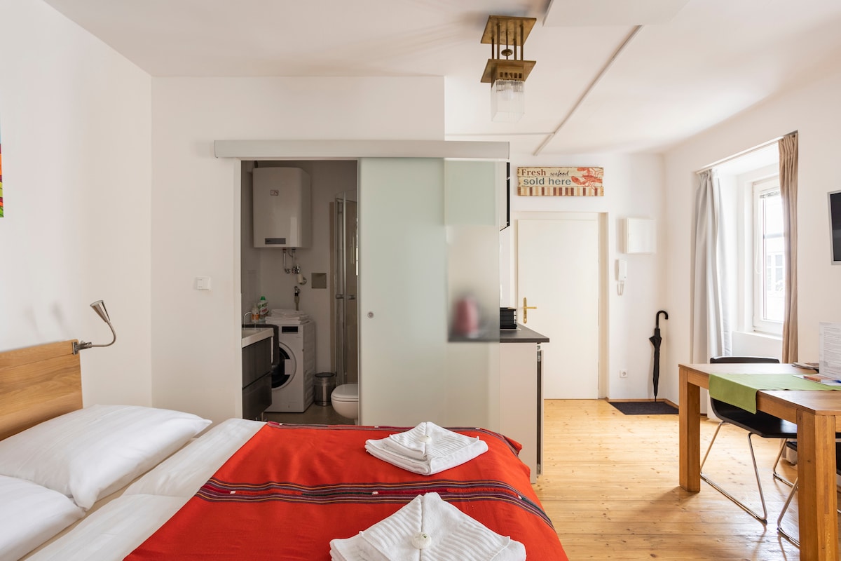 Descubra a vida na cidade no seu melhor no nosso apartamento recém-renovado e altamente central de 40m ². Situado no 2º andar de um edifício histórico, este espaço exclusivo possui uma espaçosa sala de estar, quarto confortável, casa de banho com sanita e uma cozinha bem equipada. As comodidades adicionais incluem um sofá-cama, TV, WLAN, máquina de lavar roupa e uma cozinha completa. Todas as suas necessidades diárias, lojas, cafés e restaurantes ao virar da esquina. Mergulhe na arte, cultura, compras e pontos turísticos a poucos passos de distância.