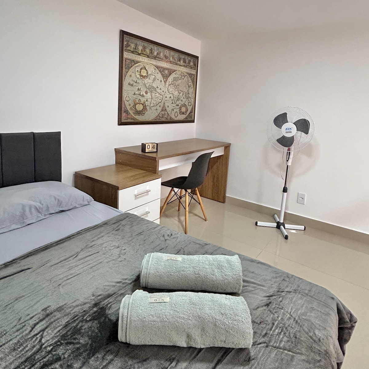 Apartamento no bairro Cambuí. Muito limpo e organizado. Cama Queen com jogo de cama e com toalhas de banho e rosto. Na sala tem um sofá que pode dormir uma pessoa confortavelmente! Apartamento silencioso, bem iluminado, seguro, com fechadura eletrônica. O prédio possui elevador, academia, sala de reunião e piscina. O bairro Cambui é o mais badalado da cidade, tem muitos restaurantes, bares, padaria, cafés, farmácia. No 8º andar fica a piscina. PROIBIDO FESTAS, FUMAR E ANIMAIS