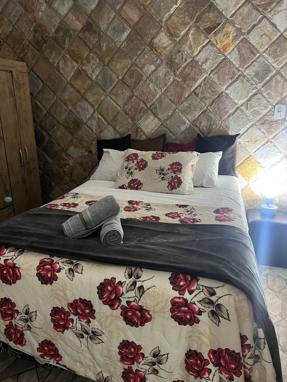Quarto em área de terraço com banheiro privativo, cozinha e área de tanque. Vista para montanhas. A hospedagem está situada em uma rua e bairro tranquilos. Normalmente há vagas para estacionar bem em frente. Caso precise, também podemos oferecer vaga de garagem, mediante consulta e taxa adicional. Sob consulta, também é possível receber mais de um casal no espaço, desde que tragam suas próprias barracas de camping. Aceitamos pets somente de pequeno e médio porte.