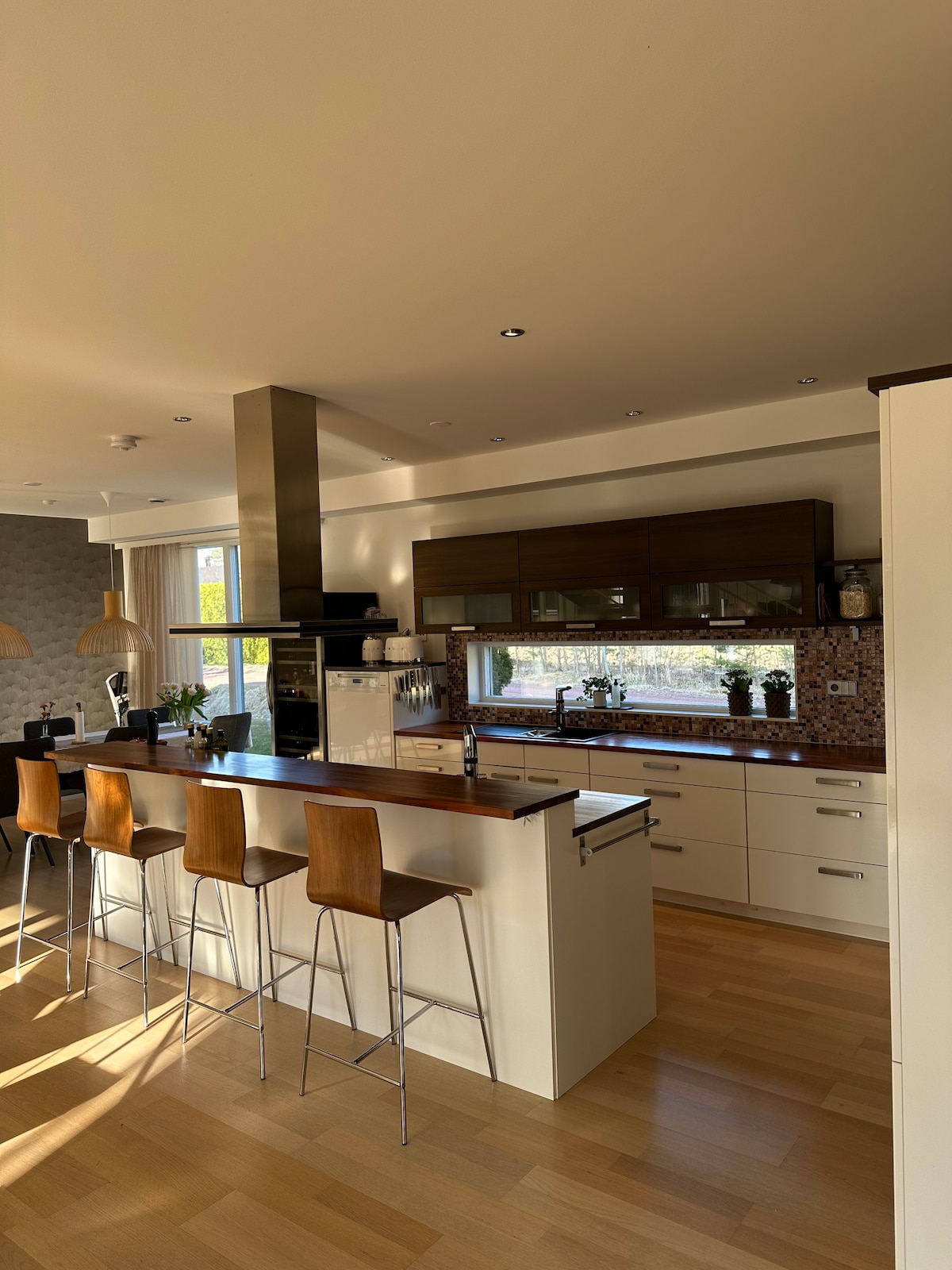 A trinta metros do mar. Vista para a entrada de dois terraços. E jacuzzi. Seis camas novas em três quartos. No andar de baixo: sala de estar, cozinha, dois quartos, sauna, banheiro e lavanderia. No andar de cima: quarto principal, escritório e banheiro. Mesa de jantar para seis pessoas, interna e externa. Wi-Fi. TV a cabo. Estacionamento para dois carros na garagem. A uma curta distância das balsas. Carro 5 min, bicicleta 10 e caminhada 25 minutos para a cidade. Duas canoas para alugar. A mais bela trilha de caminhada e corrida de Mariehamn abaixo do grande terraço.