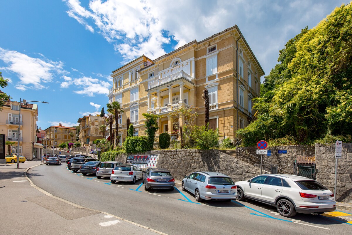Apartamento recentemente renovado em 117 anos de idade villa austro-húngara, a poucos metros de distância do mar, mesmo em cima da bela marina de iates e passeio marítimo de Franz Jozef I, a poucos minutos a pé do centro histórico da antiga cidade resort de verão aristocracia de Opatija. A partir da varanda de 14 metros quadrados, você pode desfrutar da vista ensolarada da baía de Kvarner, das vilas históricas circundantes, do jardim verde ou ter uma noite relaxante com a sua bebida favorita, enquanto as luzes da cidade refletem do mar Adriático.