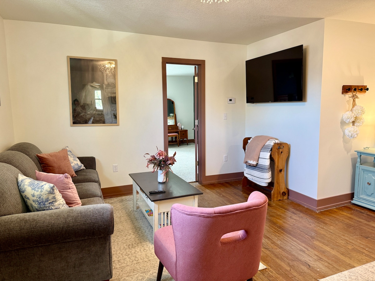 Bem-vindo à nossa espaçosa suite King, um retiro privado cuidadosamente concebido, perfeito para casais, viajantes individuais ou estadias prolongadas. Esta suite de estilo bonito combina charme histórico com conforto moderno — com uma luxuosa cama king, lareira acolhedora, cozinha completa e área de estar convidativa. Quer esteja a visitar para uma escapadela de fim de semana ou a instalar-se para uma estadia mais longa, este espaço foi concebido para se sentir calmo, confortável e facilmente habitável.