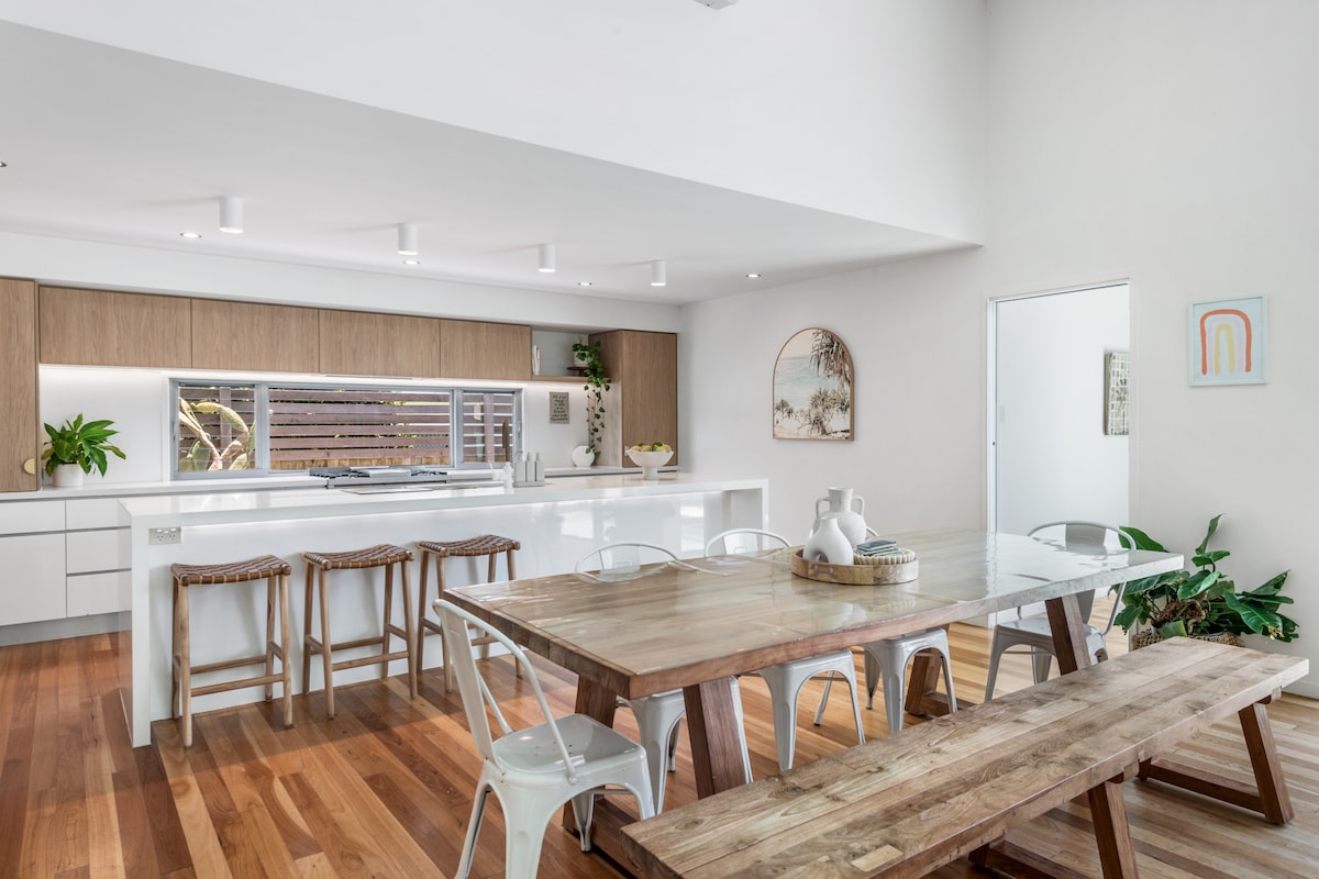 Linda casa estilo resort a 200 metros do rio Maroochy. Espaçosa sala de estar em plano aberto com vista para o ar livre e para a área da piscina. Lugar perfeito para uma viagem em família com várias áreas de estar. A casa tem um belo ambiente com vistas encantadoras para o Monte Coolum. 4 quartos com banheiro privativo e closet. Toalete separado e banheiro e lavabo. A cozinha está equipada com todas as ferramentas de que você precisa para cozinhar um banquete, incluindo uma placa de teppanyaki e fogão a gás. Quintal totalmente cercado. TODOS OS ANIMAIS DE ESTIMAÇÃO DEVEM SER APROVADOS
