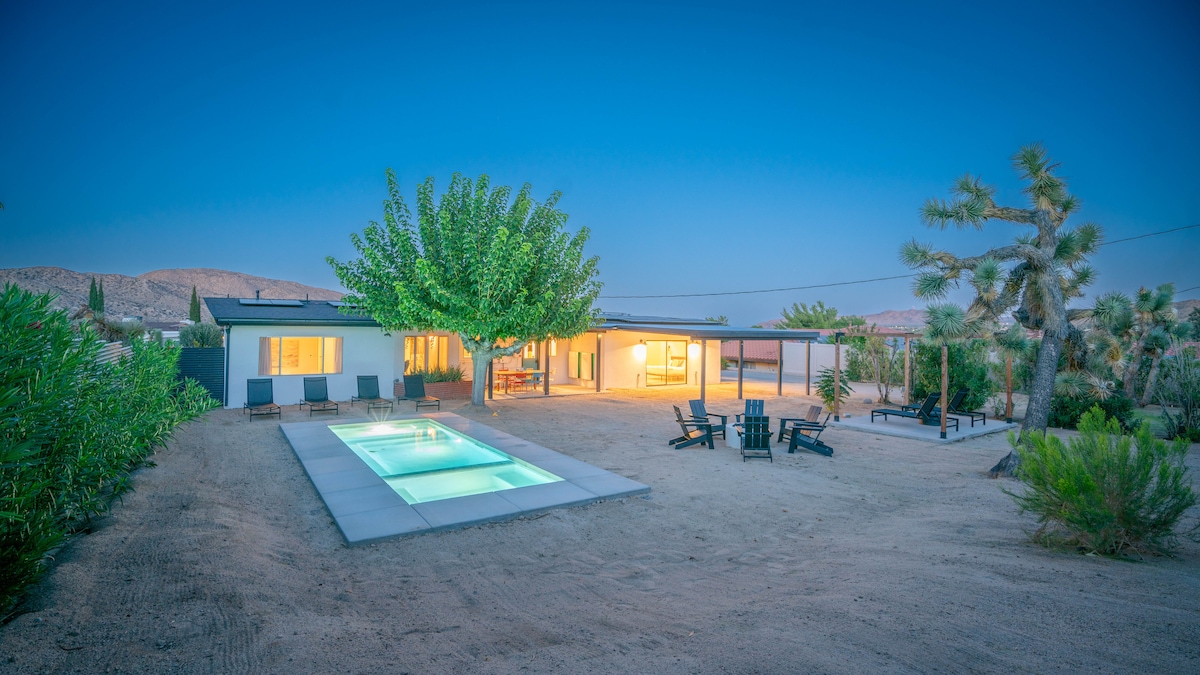 Desert Spa Retreat! Private Infrared Sauna, Saltwater Cold Plunge, and a Hot Tub under stunning star-lit nights. JOSHUA TREE base for Hikes & Exploration. Ten-minute drive to the West Gate of the National Park. Stunning views, cozy King/Queen beds, Fast WiFi. Backyard Fireplace & Telescope for stargazing. Fully equipped Kitchen & Free Parking. 5-star Reviews for eight years. Book your rejuvenating escape!